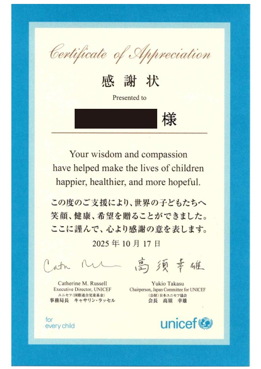 私が遺言執行者に指定されている方の遺言執行が完了し、遺贈先である公益財団法人日本ユニセフ協会に寄付させていただきました。