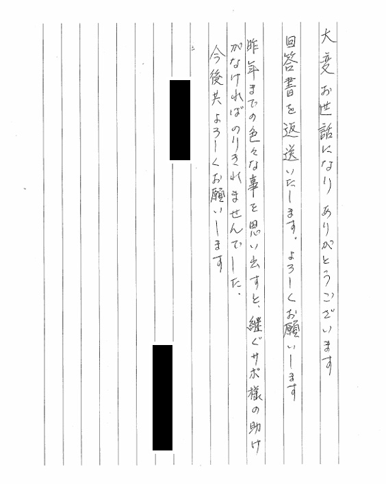 お手紙を拝見し、お礼のお電話を差し上げたところ、このようなお言葉をいただきました。